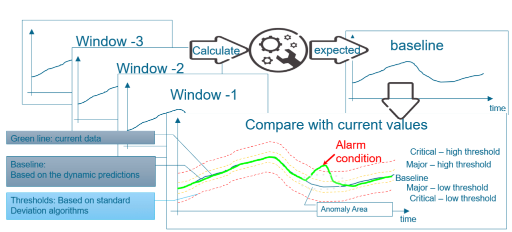 Following the simple illustrative diagram shown in the next figure, the Machine Learning usual strategies [6]  (which have already proven to be significantly faster than the previous techniques) are able to identify alarm conditions by dynamically comparing the values ​​monitored by the network with the expected values, which are predicted based on a model initially obtained from the preliminary learning phase and then continuously dynamically updated.